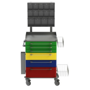 Pracovní plocha vozíku je z nerezové oceli AISI 304 s 12mm prolisem, ochrannými rohy a nosností 20 kg. Čela zásuvek jsou z kompaktního plastu (ABS), barva je volitelná ze vzorníku.